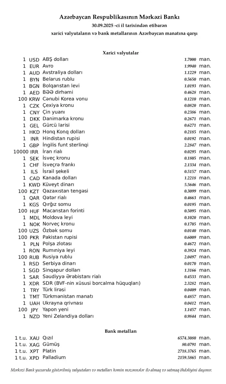 Rəsmi məzənnələr açıqlandı