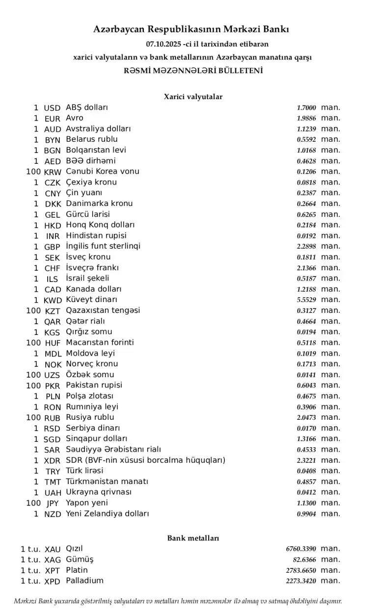 Azerbaycan Merkez Bankası’nın bugünkü resmi döviz kurlarına göre, ABD dolarının kuru değişmeyerek 1,7000 manat olmuştur.
