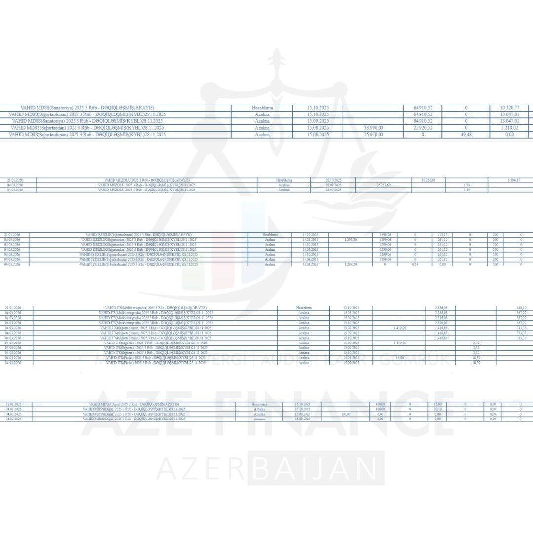 Belirtmek gerekir ki, bu süreç, vergi uzmanı Azer Kasimov denetiminde profesyonel muhasebeci Raci Aslanov tarafından azaltılmıştır. Vergi ve muhasebe alanındaki deneyimi ve doğru analitik yaklaşımı sayesinde konu hızlı bir şekilde incelenmiş ve hukuki çerçevede çözülmüştür. "Vergi yükümlülükleri kapsamında 40 651,77 AZN, Zorunlu Devlet Sosyal Sigortası (MDSS) primi olarak 78 007,01 AZN, işsizlik sigortası primi olarak 3 011,53 AZN, girişimcilik faaliyeti kapsamında 120,10 AZN ve Zorunlu Sağlık Sigortası kapsamında 3 421,62 AZN olmak üzere toplam yükümlülük tutarı 125 212,03 AZN’dir." Bu tür profesyonel yaklaşım, girişimcilerin finansal risklerini en aza indirmede önemli rol oynar.